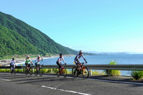 海沿いのアップダウンコースを逃げるロベルト・ヘーシンク(オランダ、ロットNLユンボ)ら photo:TDWsport/Kei Tsuji