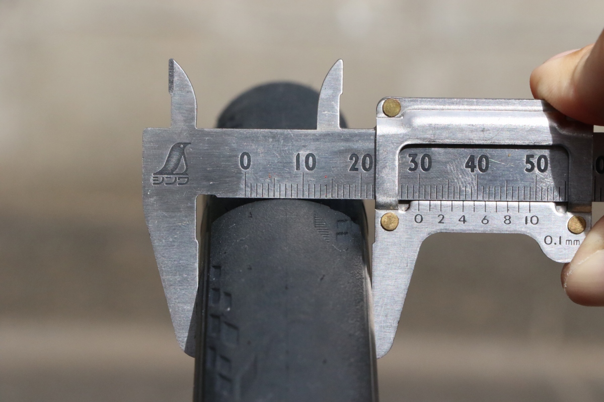 リム内幅が21mmのシマノDURA-ACE C50 TLにSTORM R1 TLRの700×28Cと30Cを取り付けていき、最大空気圧でのタイヤ幅を実測していく。ノギスで計測すると28Cでは30mm、30Cでは32mmとなった。