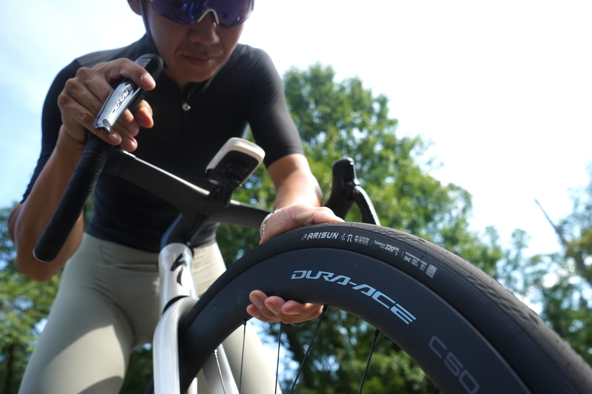 今回のテストホイールであるシマノDURA-ACE C50 TLホイールにアリスン STORM R1 TLRの28Cを装着した。しなやかな220TPIケーシングのおかげもあり、チューブレスタイヤ装着のコツを掴んでいる方であれば簡単に取り付けられるだろう。