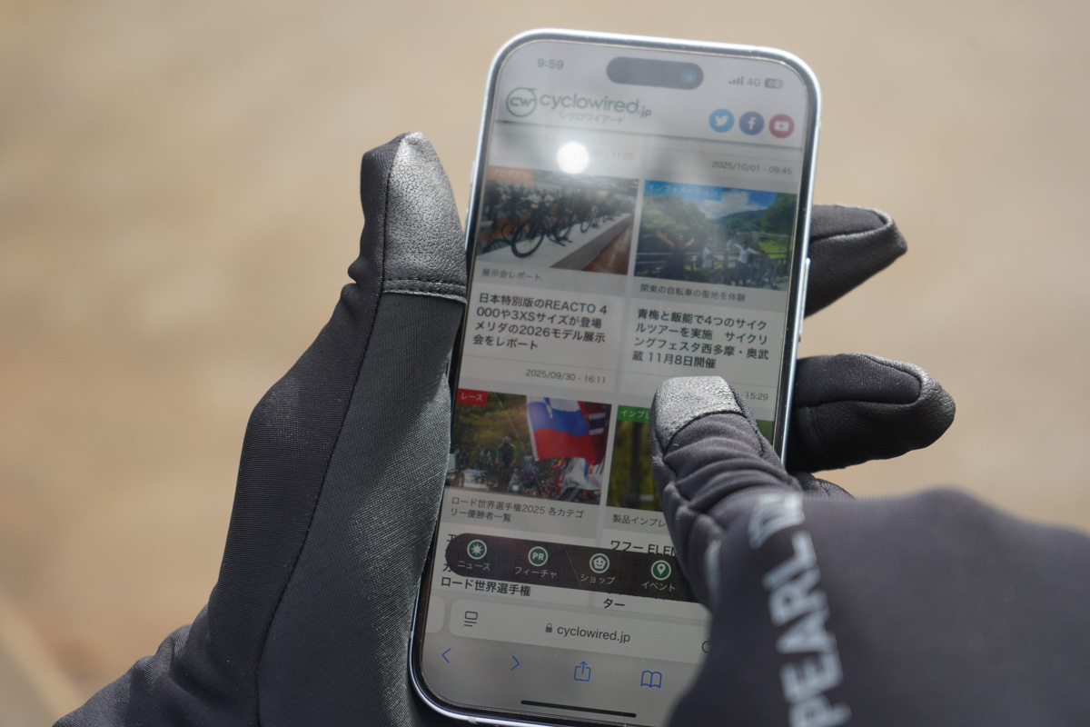 手の平にパッドがない仕様は、よりダイレクトな操作性を求めるライダーには魅力的。親指の指股にパネルを一枚追加することで、ゴロつき感を抑えているのも細やかな配慮だ。タッチパネル対応の指先により、ライド中にスマートフォンやサイクルコンピューターの操作が可能となっている。