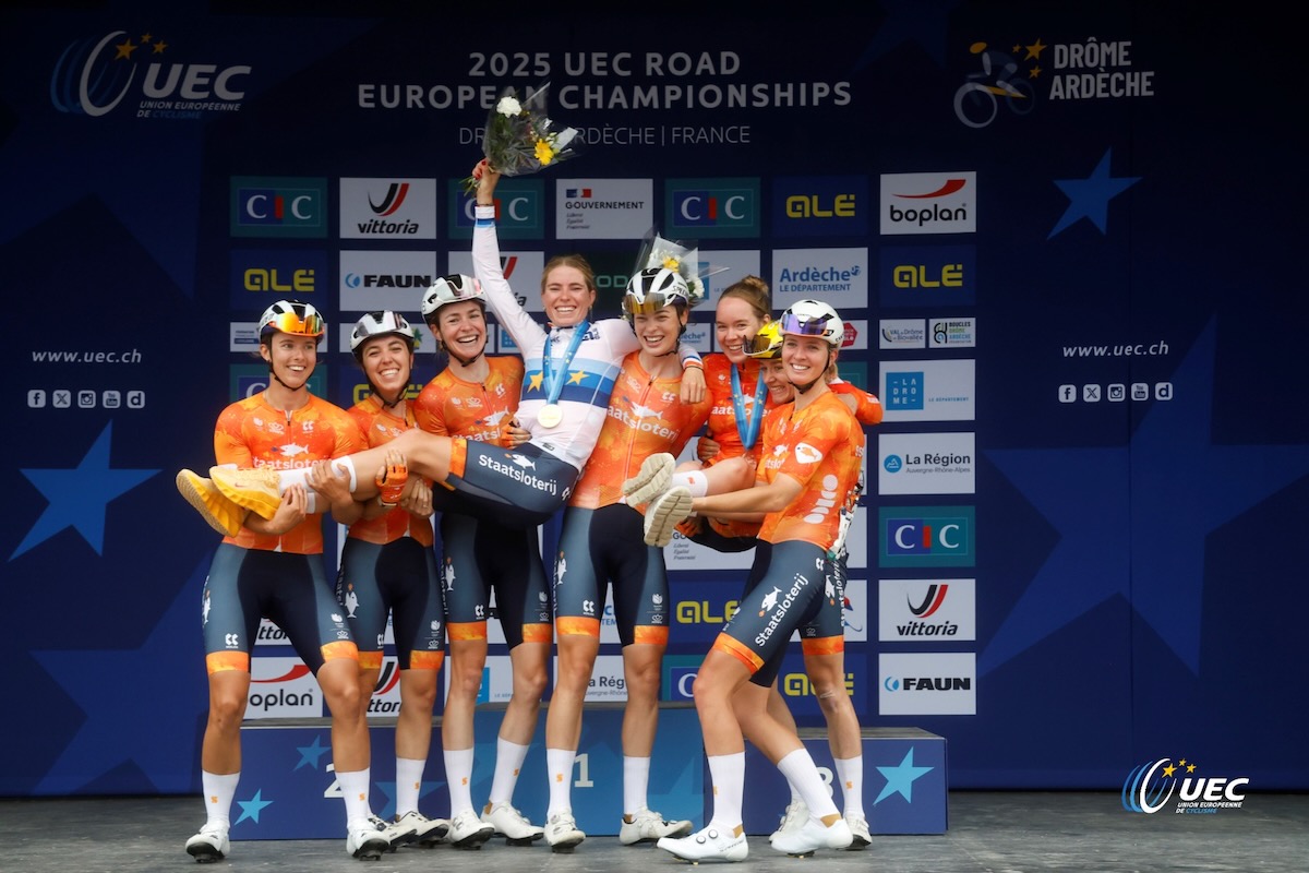 2019年から7年連続でオランダ人優勝者となったフォレリング。「このチャンピオンジャージをオランダに持ち帰ることができて誇りに思う。私たちは完璧なレース展開に持ち込み、自分自身調子もよく、自信もあった。それに世界選手権に向けて行ったTTのトレーニングも積んでいたので、長い距離の独走を狙った。世界選手権から続く素晴らしいチームの走りを勝利で締めくくりたかった」と、喜びを語った。
