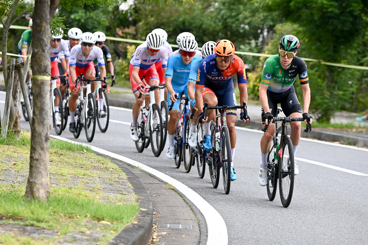 11周目、先頭集団とメイン集団の距離が縮まったところで、エリオット・シュルツ(ヴィクトワール広島)と、ディラン・ホプキンス(ルージャイ・インシュアランス)の2名が先頭集団に合流。入れ替わりでミルティアディスが遅れ、4名の先頭集団が再構成される。