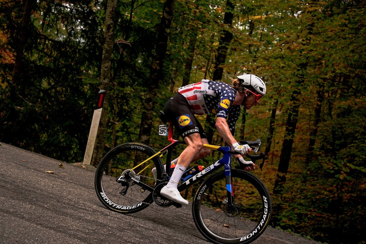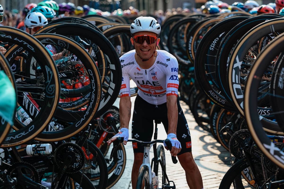 スタート前には選手たちによって作られた花道を、このレース限りで引退するラファウ・マイカ(ポーランド、UAEチームエミレーツXRG)を筆頭にルイス・メインチェス(南アフリカ、アンテルマルシェ・ワンティ)ら7名が通過。4連覇中のタデイ・ポガチャル(スロベニア、UAEチームエミレーツXRG)を先頭に、現地時間午前10時55分にスタートの旗が振られると、星条旗があしらわれたアメリカ王者ジャージを着た、クイン・シモンズ(リドル・トレック)が勢いよく飛び出した。