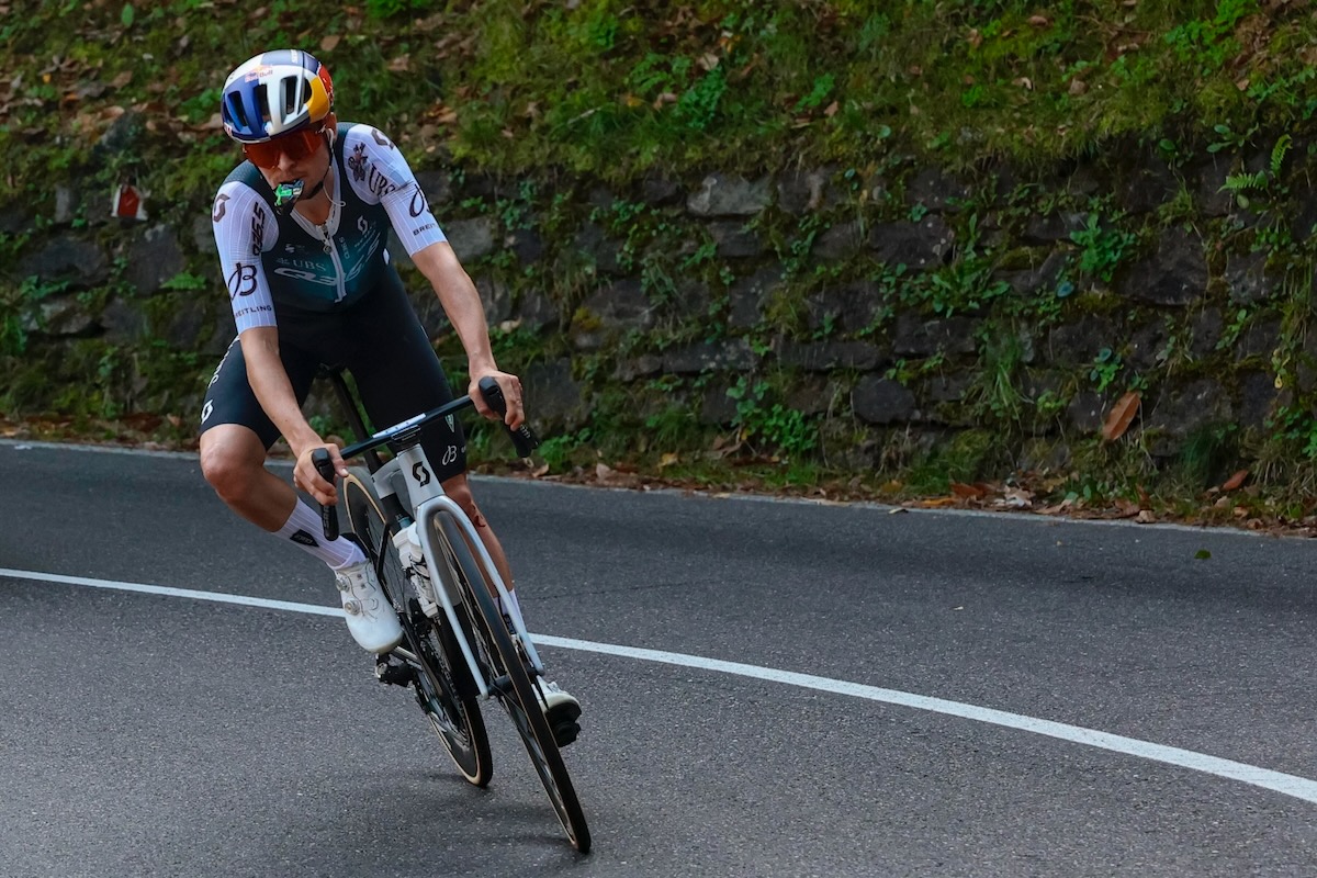後続ではライバルたちの抑え役を担うはずだったデルトロが遅れ、エヴェネプールとシモンズ、ストーラーの3名が追走集団を形成。しかし頂上手前でシモンズが遅れ、続く19個のヘアピンが続く下りでストーラーが脱落。レースは9月28日のロード世界選手権、10月5日のロードヨーロッパ選手権と同様に、単独先頭のポガチャルをエヴェネプールが追う構図になった。