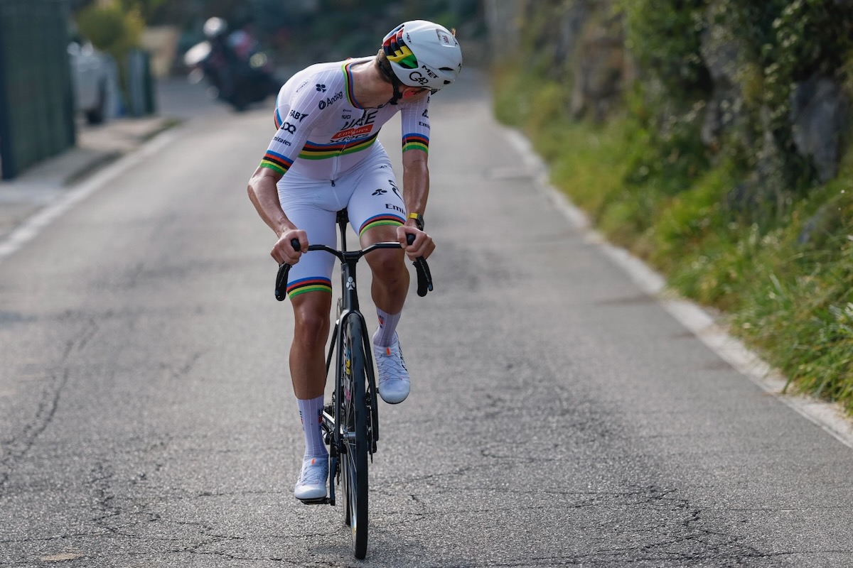残り40.7km地点から始まるパッソ・ディ・ガンダ(距離9.2km/平均7.3%)に、シモンズは2分20秒のリードで突入。プロトンではジェイ・ヴァイン(オーストラリア、UAEチームエミレーツXRG)が作るハイペースに人数は絞られ、ポガチャルの背後にはエヴェネプールやピドコックなど優勝候補が並ぶ。さらにヴァインがもう一段踏みを強めるとピドコックらが遅れ、その後ろにはポガチャルとイサーク・デルトロ(メキシコ)の他に、エヴェネプールとマイケル・ストーラー(オーストラリア、チューダー・プロサイクリング)、ポール・セクサス(フランス、デカトロンAG2Rラモンディアール)しか残らなかった。
