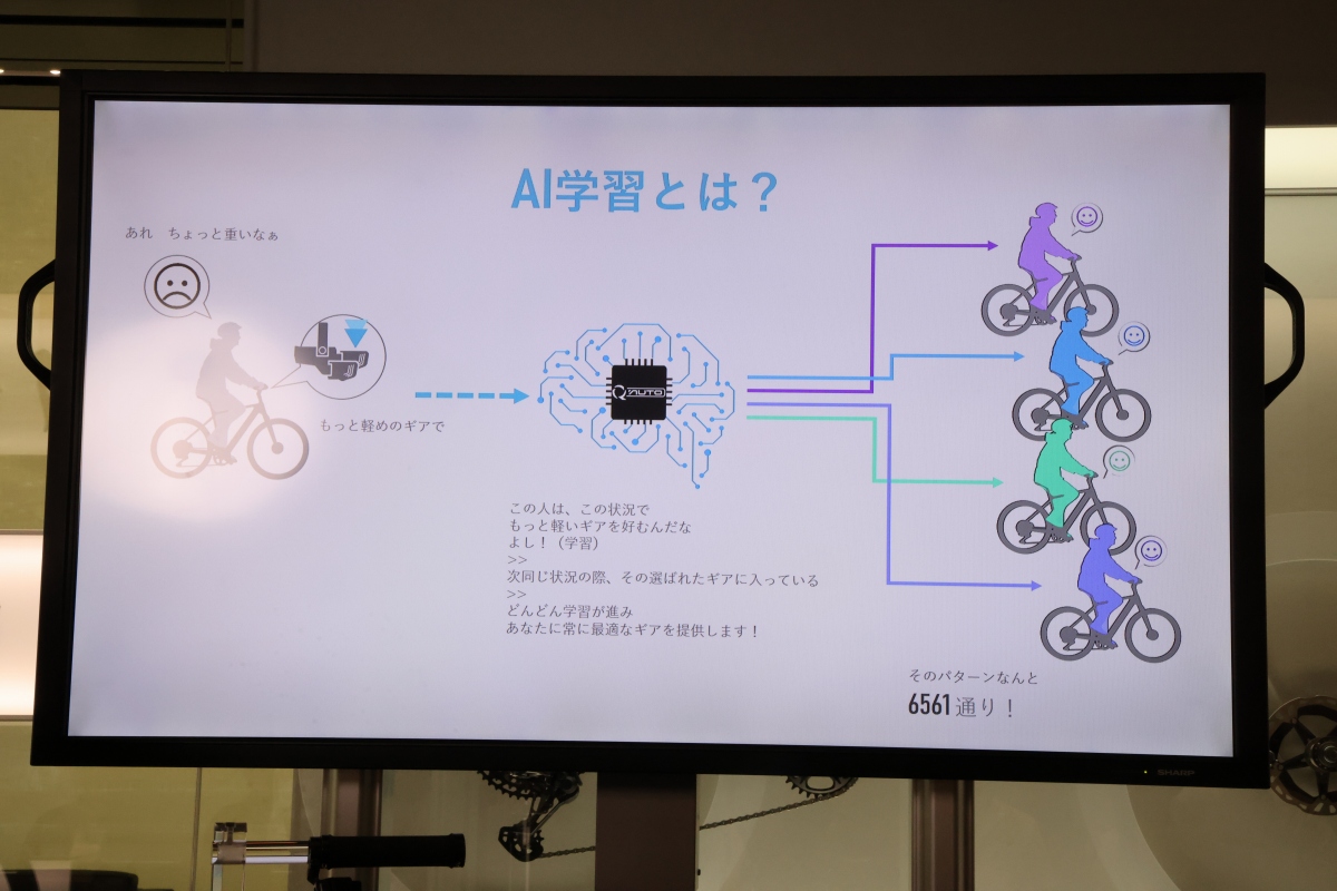 自分でギアを選択可能なようにスイッチを用意しているのですが、この変速スイッチを押すたびにどんどん学習が進んでいく。この人は、この速度、傾斜、ケイデンスだとギアを軽くするのだな、というように常に学習してくれ、次に似たようなシチュエーションになった時には、既に軽いギアに変速してくれている。具体的には6561通りのパターンで、常に最適なギアが提供されるようになっています。