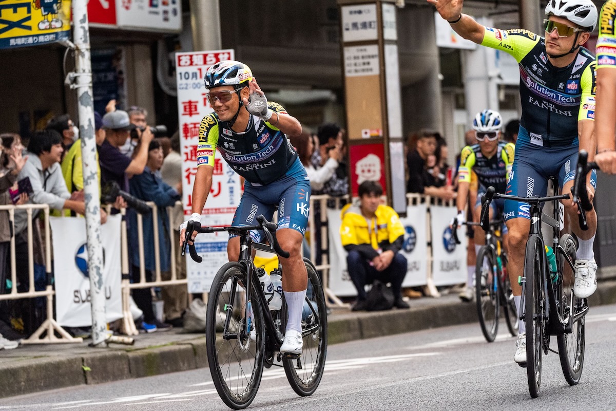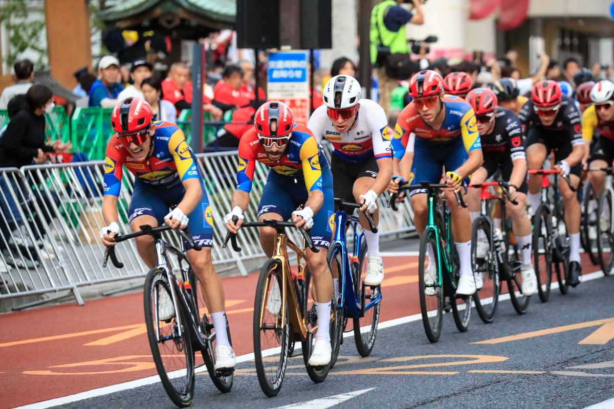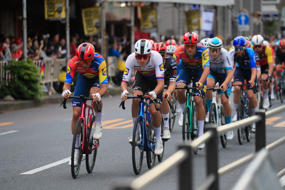 イスラエル・プレミアテックが積極的にアタックを仕掛けるものの、集団前方にメンバーを配置したリドル・トレックがその全てをチェックし、追いかけ、潰していく。メタリックカラーの特別バイクをあつらえたメンバーが、ツール・ド・フランスのマイヨヴェール(ポイント賞)をイメージしたグリーンバイクに乗るミランを勝たせるために、そしてジャパンカップクリテのチーム6連勝を達成するために、徹底的な集団コントロールを続けた。