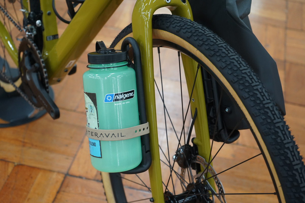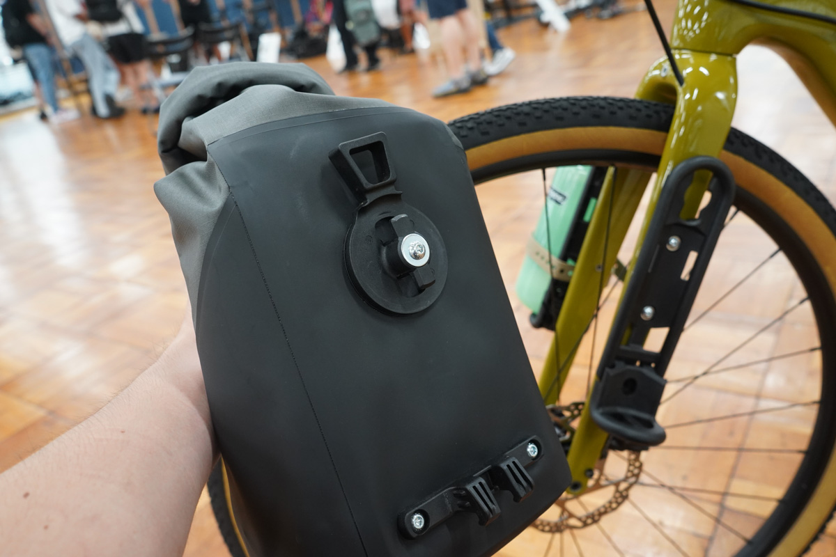 そのバッグがHemlockだ。容量7リットルのロールトップ式防水バッグで、ビルトインされているフックをケージに引っ掛けて、レバーを90度回転させるだけで確実に固定が可能。これまでのフォークケージを活用して大容量ストレージを持ち運ぶ時はベルトで止める作業が必要だったが、FLIPシステムによってその作業から解放される。
