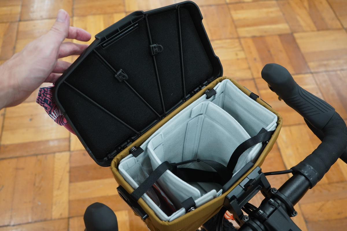 またこのバッグの特徴でもあるハードなフラップに備えられているポートが3つに増設。これによってサイコン、スマホ、ライトを同時にマウントすることが可能となった。もちろん内部ストレージも広くなったおかげで、収納できるものの可能性が広がっているため、バックポケットのないTシャツなどでサイクリングを楽しみたいという方にはぴったりなプロダクトだ。