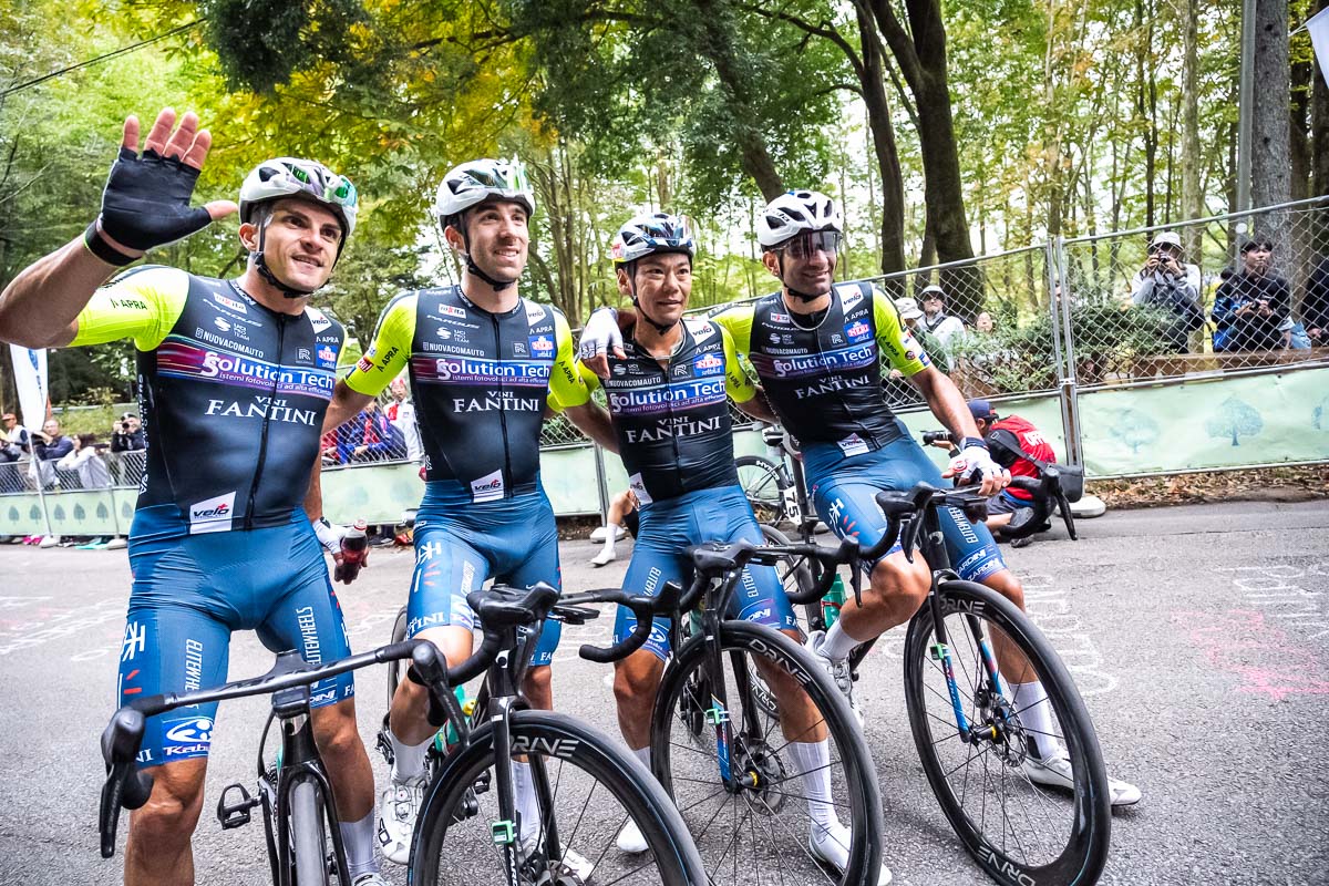 完走したチームメイト達と記念撮影を行う新城幸也(ソリューションテック・ヴィーニファンティーニ) photo: Yuichiro Hosoda