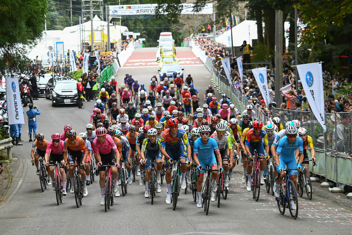 宇都宮森林公園は曇りながら、半袖でも問題ないほどの暖かさ。レースコースは幾多の名勝負を生み出してきた古賀志林道(釣堀〜頂上間1.14km/平均勾配8.4%)を含む1周回10.3kmのコースを合計14周する144.2kmで、獲得標高は2,660m(1周回当たりの獲得標高は190m)に及ぶ。この日はスタート直後の古賀志林道でいきなりワールドチーム勢が動いた。