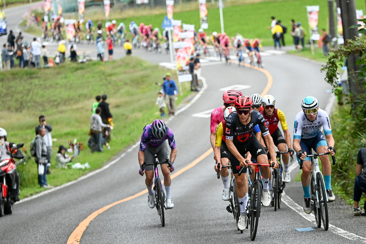 マルティネスのアタックに追従したのはアレックス・ボーダン(アメリカ)とコフィディスのヨン・イサギレ(スペイン)とサム・メゾノブ(フランス)、ライリー・シーアン(アメリカ、イスラエル・プレミアテック)、マティス・ロンデル(フランス、チューダープロサイクリング)、ツアー・オブ・ジャパン覇者アレッサンドロ・ファンチェル(イタリア、TEAM UKYO)という面々。一方でマシューズやベンジャミ・プラデス(スペイン、VC FUKUOKA)らはここで勝負を取りこぼしてしまった。