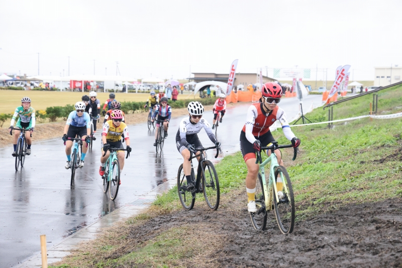 朝から雨が降り続き、女子エリートまでの様々なレースが行われたため、キャンバーセクションは乗車が困難なほどのマッドコンディションで2番手グループは混戦となる。椿井和佳奈と山下、竹村が先頭をひた走る石田を追いかける展開。