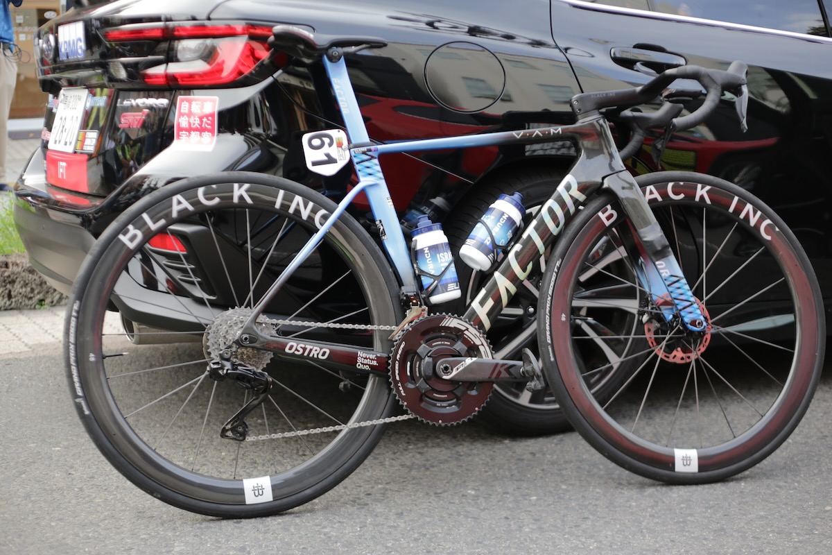 EF勢と同じく、シマノのDURA-ACEを基本としながらもFSAのクランクセット(POWERBOX K-FORCE/クランク長165mm)を組み合わせる。ホイールはOSTROと同時にデビューしたブラックインクの「48/58」。タイヤはコンチネンタルのGRAND PRIX 5000TT TR(28mm幅)。