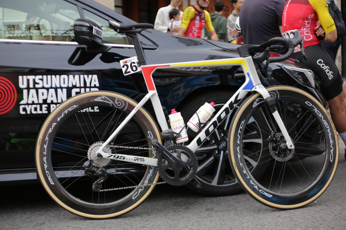 ジャパンカップ連続出場中のコフィディスが駆るのはルックのエアロモデルである795 Blade RS。多くのメンバーが白地にモンドリアンカラーの795に乗っていたが、注目はエースのヨン・イサギレ(スペイン)のバイク。黒地のこの795は、今年のツール・ド・フランスを走るメンバーに供給された特別な「Iconic Black Radial」デザインだ。