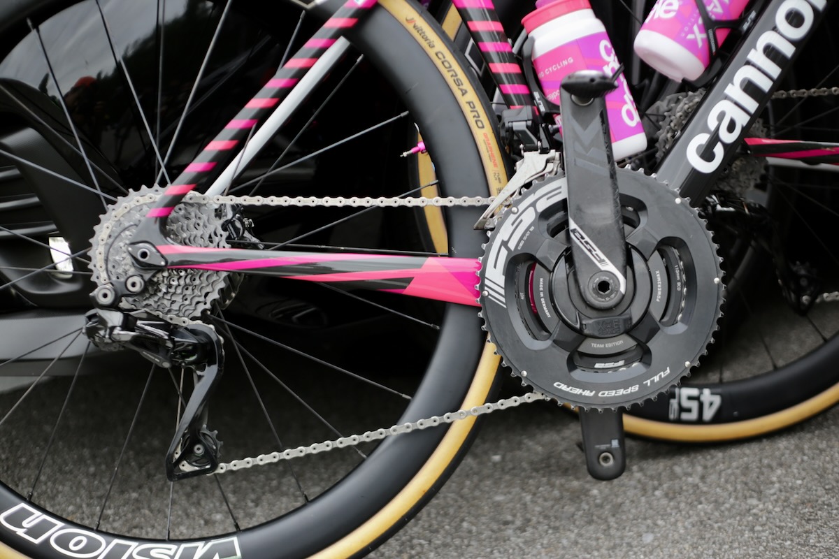 ジャパンカップ連覇を目指して来日したEFエデュケーション・イージーポストは、今年もキャノンデールのハイエンドモデルであるSuperSix EVOを駆る。色合いの異なるピンクを組み合わせたバイクとチームキットはプロトンの内の注目の的。フレームにはLAB71のネームが記されているが、実際はHi-MODグレードだ。