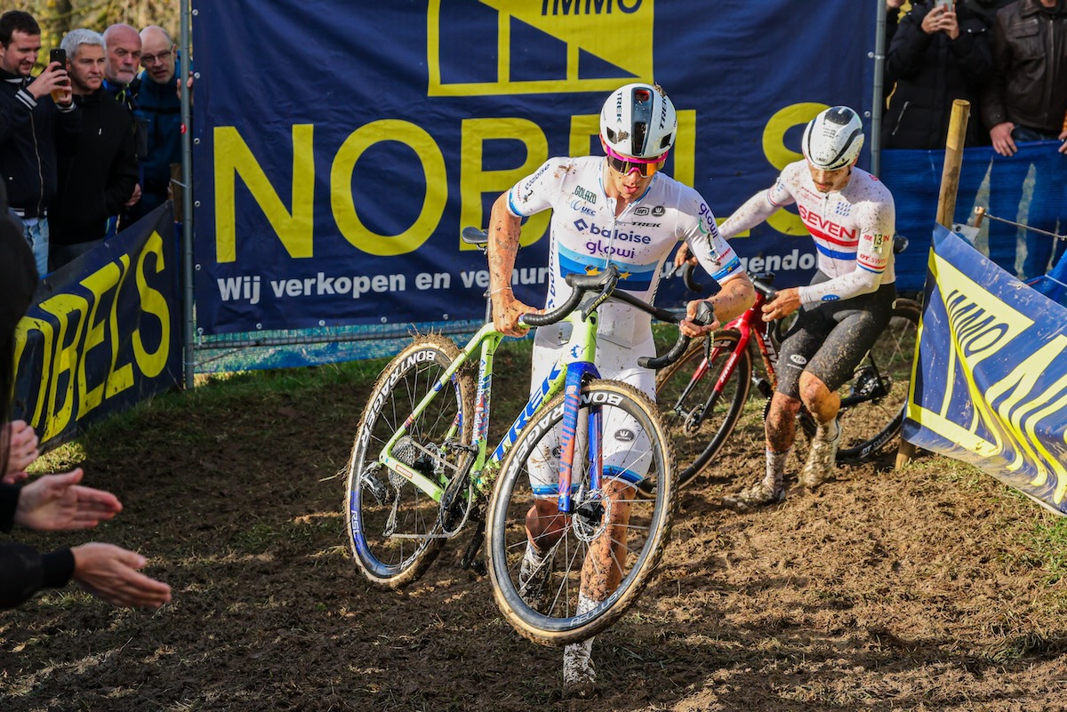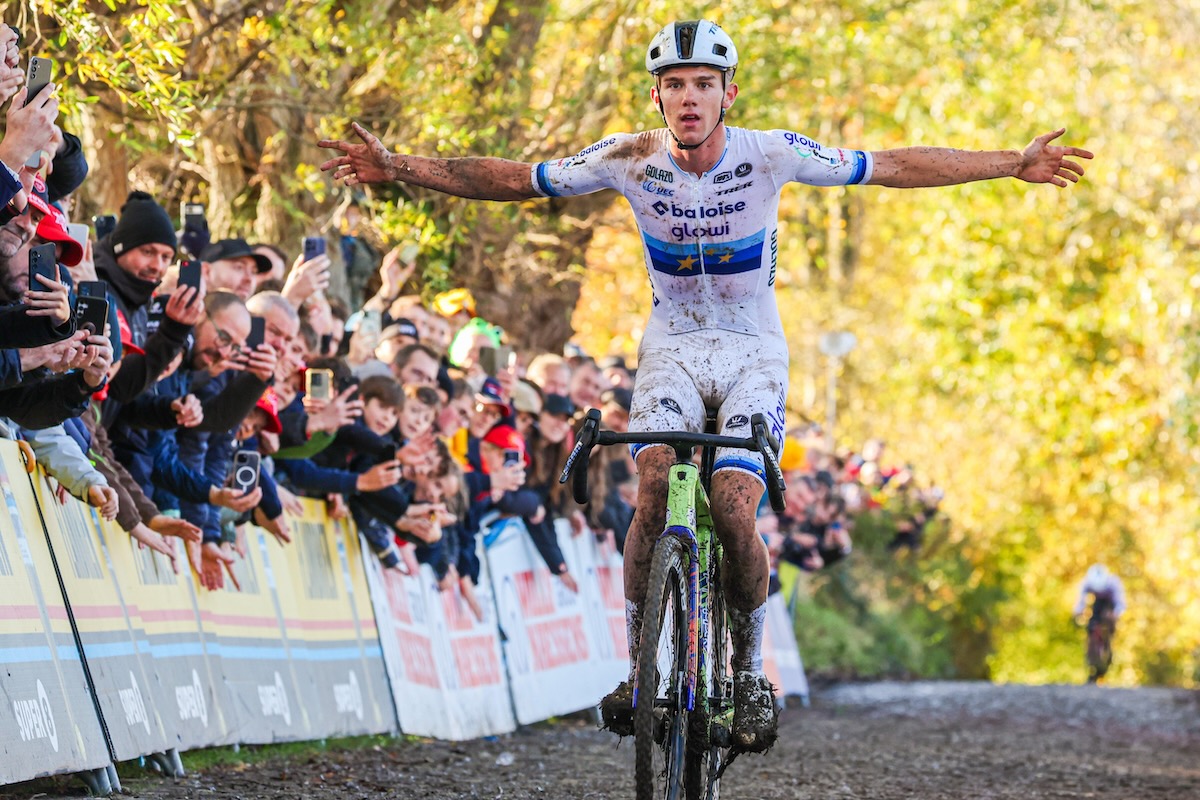 男子エリートレースを席巻したのは今季初戦を迎えたティボー・ネイス(ベルギー、バロワーズ・グローウィ・ライオンズ)だった。欧州チャンピオンジャージを着るネイスは2周目には先頭に立ち、持ち前のスキルで泥コースを華麗に攻略。唯一追従したキャメロン・メイソン(イギリス、セブンレーシング)も徐々に水を空けられ、バリアに引っかかってジ・エンド。こうして後続を振り切ったネイスがフィニッシュラインまで逃げ切った。