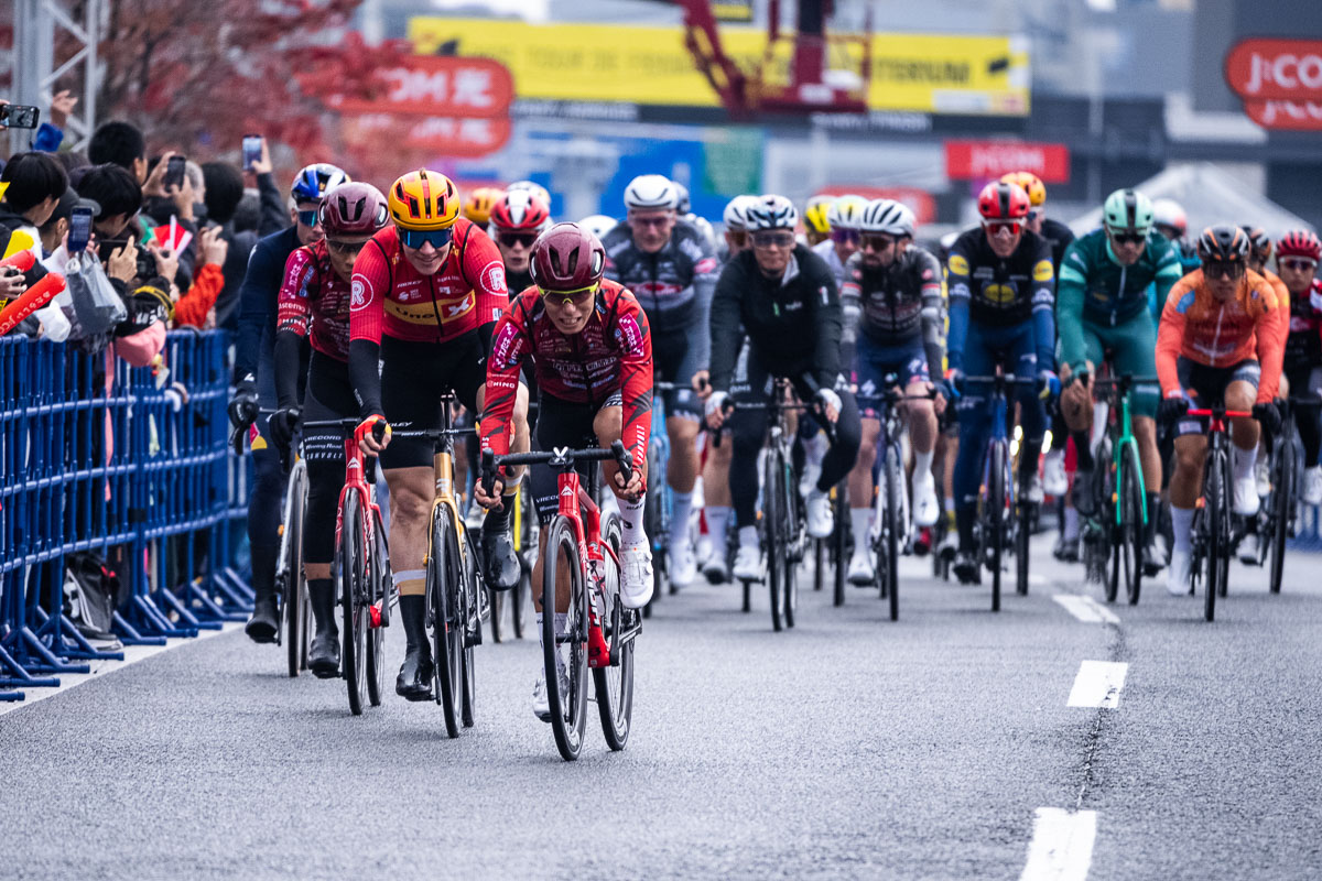 外国チームの選手22名、国内チームの23名、合わせて45名の選手たちによる集団の先頭には、ツールで過去2度(2023、24年)の総合優勝を果たし、今年総合2位だったヨナス・ヴィンゲゴー(デンマーク、ヴィスマ・リースアバイク)やプリモシュ・ログリッチ(スロベニア、レッドブル・ボーラ・ハンスグローエ)が並ぶ。さらに、今年ツール初出場ながら区間2勝とマイヨヴェール(ポイント賞)を獲得したジョナタン・ミラン(イタリア、リドル・トレック)など、紛うことなき世界トップ選手たちが集結。そしてスタートが告げられると、アリーナ内の出発地点をゆっくりと発進した。