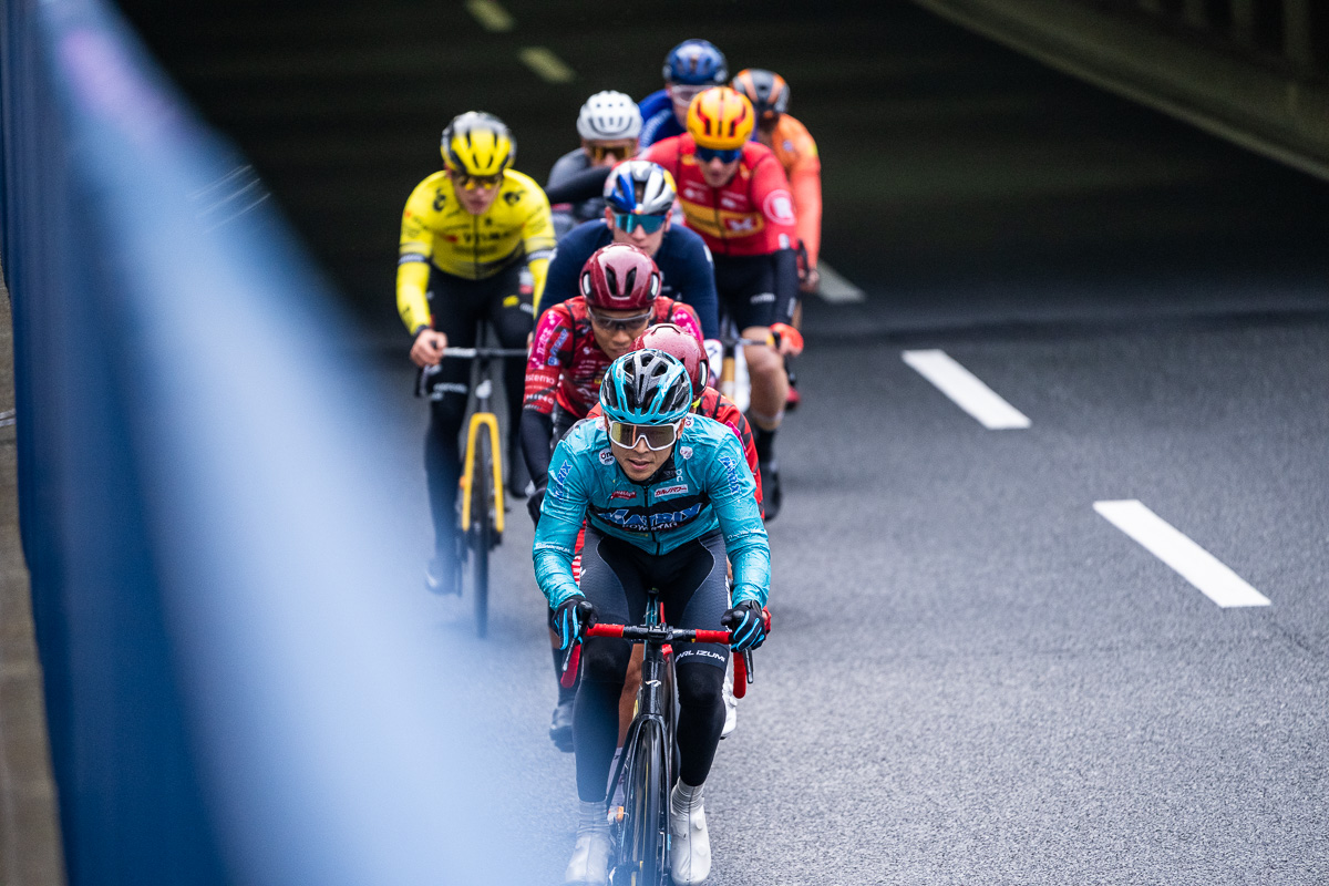 残り9周(31.5km)に入り、さらにプロトンからはミランと序盤の後輪パンクから復帰したカーデン・グローブス(オーストラリア、アルペシン・ドゥクーニンク)が合流に成功。レース距離の半分を過ぎた地点で、ツールを盛り上げた選手たちが含まれた豪華な8名の逃げへと発展したものの、選手を送り込むことのできなかったウノエックス・モビリティがペースを作り、残り25kmでプロトンと一つになった。