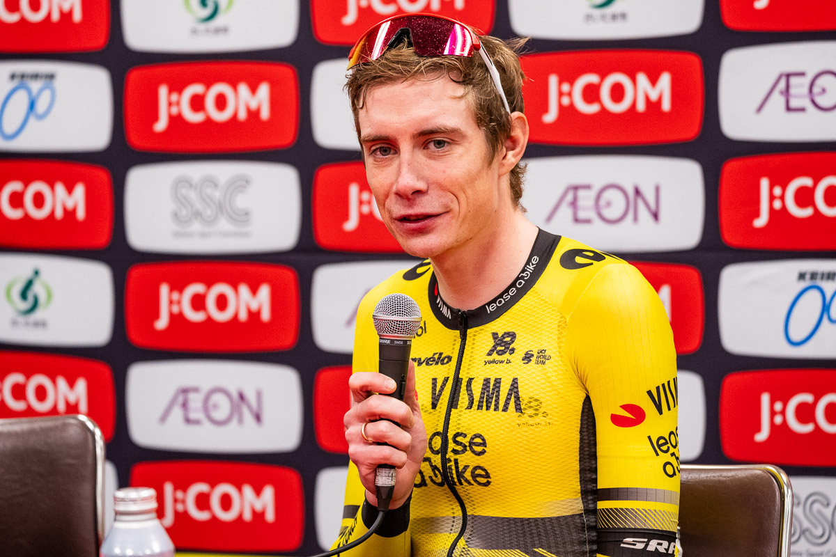 記者の質問に答えるヨナス・ヴィンゲゴー(デンマーク、ヴィスマ・リースアバイク) photo: Yuichiro Hosoda