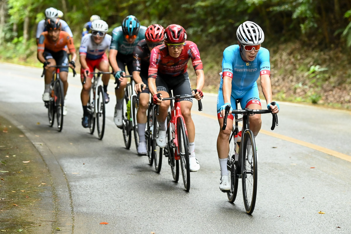 この時点で集団に残ったのは20名弱。残り距離が少なくなり、牽制まじりのアタック合戦が繰り返される。残り15kmを切ったところで、増田成幸(TEAM UKYO)、岡篤志(Astemo宇都宮ブリッツェン)、新城雄大(キナンレーシングチーム)、ベンジャミン・ダイボール(ヴィクトワール広島)、ジャコモ・ガラヴァリア(スワットクラブ)、チョン・ウホ(ソウル・サイクリングチーム)ら6名が先行。後続との差は一気に40秒まで広がり、最後の勝負所となる羽地への登りに入っていく。