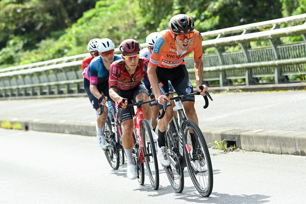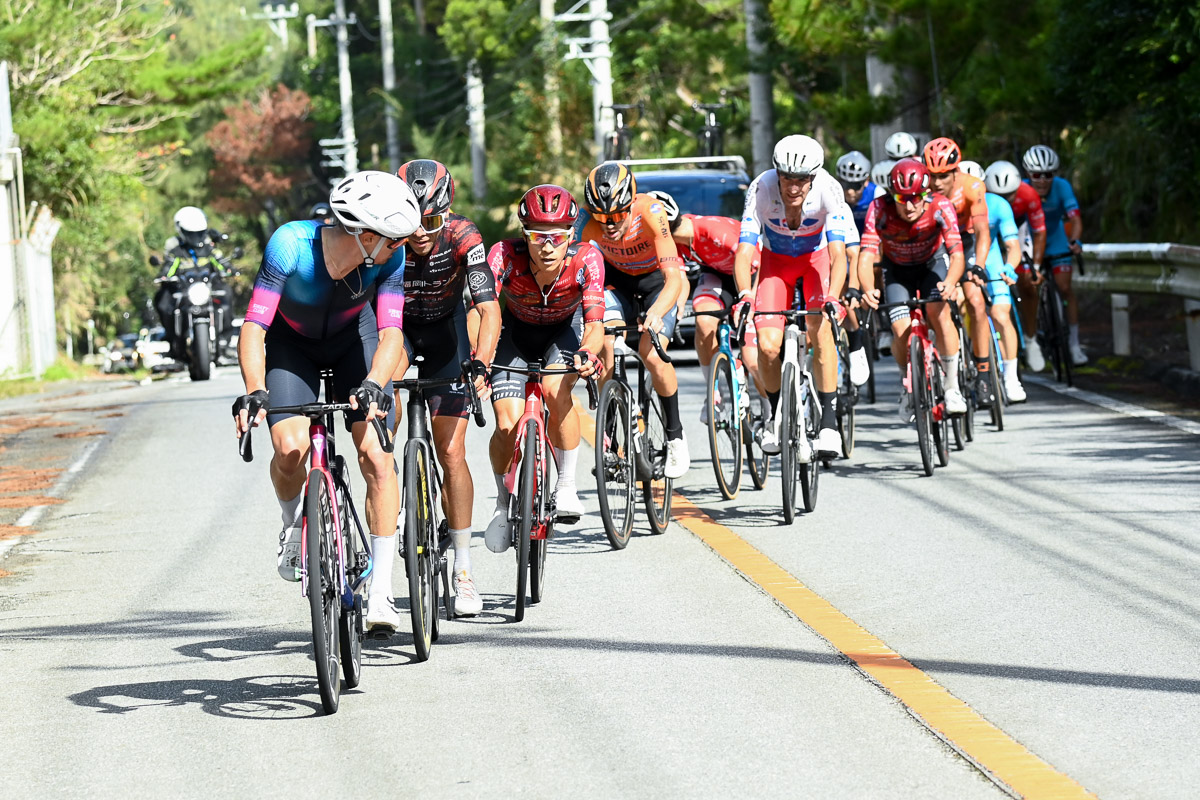 下り切って東側の海岸に出たところで、メイン集団が先行していた7名を全て吸収。短距離のアップダウンが繰り返される区間で再びアタック合戦が始まり、一昨年覇者の山本大喜(TEAM UKYO)とトマ・ルバ(キナンレーシングチーム)が抜け出す。残り60km、逃げ切れる力をもつ2名の先行に対し、後続集団は再びスワットクラブがコントロールして30秒前後の差を維持。残り30kmを切ったところで山本とルバを吸収し、三たびレースを振り出しに戻す。