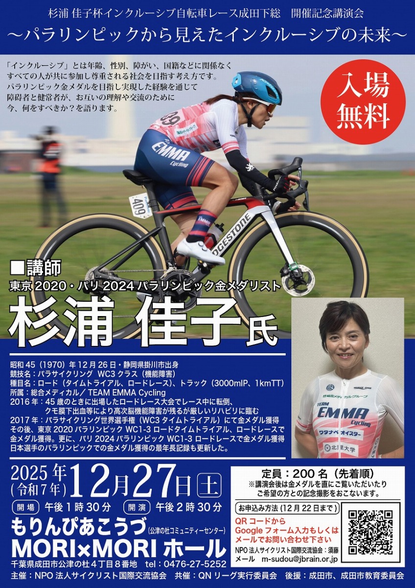 2026年2月開催の「杉浦佳子杯・第1回インクルーシブ自転車レース成田下総」に関連したZwiftライドイベントを11月13日(木)に開催する。さらに、講演会「パラリンピックから見えたインクルーシブの未来」は12月27日(土)に実施する。以下、プレスリリースより紹介しよう。
