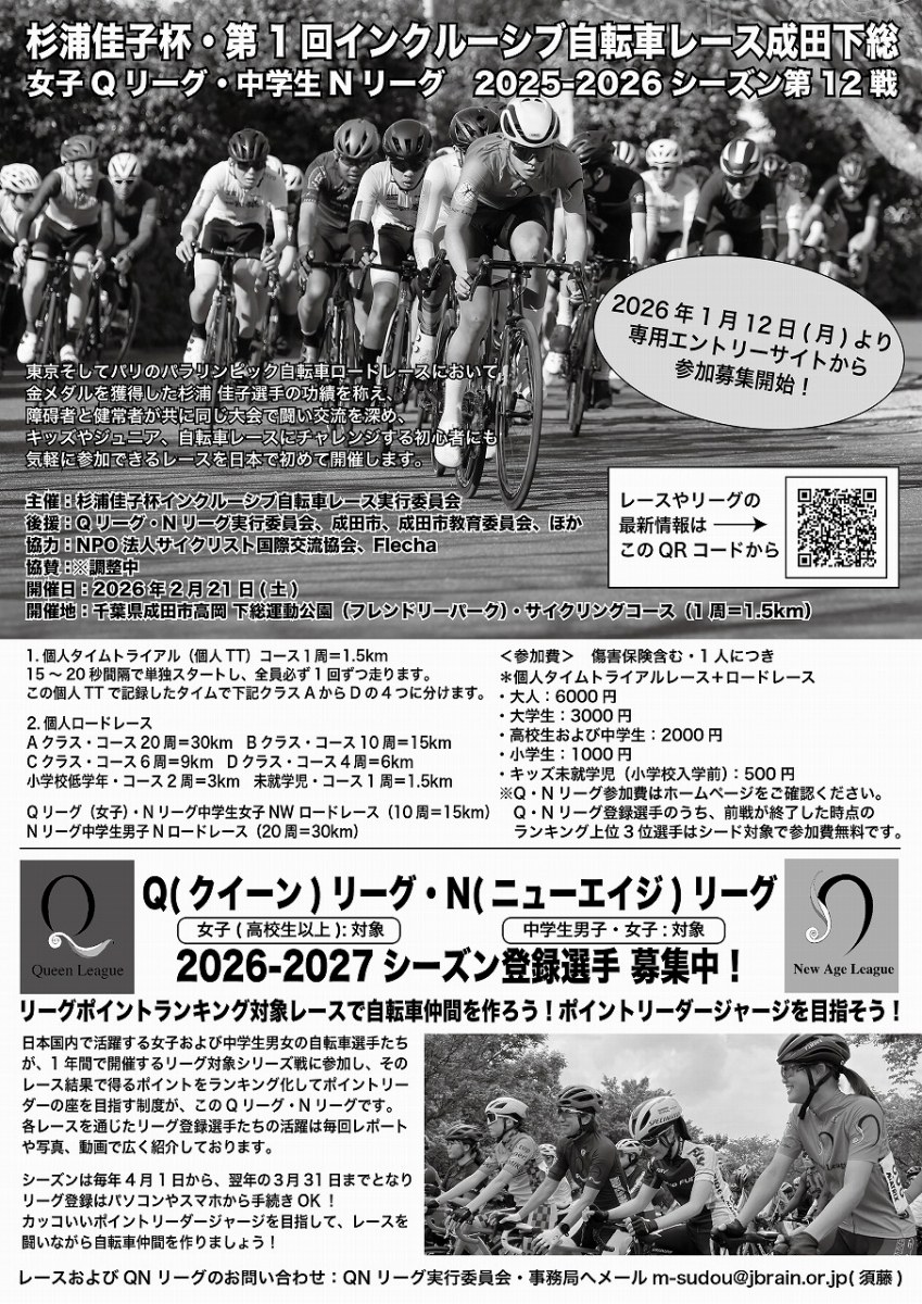 NPO法人サイクリスト国際交流協会(NPO 法人 J-BRAIN/代表:須藤むつみ)は、2026年2月21日(土)開催「杉浦佳子杯・第1回インクルーシブ自転車レース成田下総」に先立ち、以下の関連イベントを実施いたします。