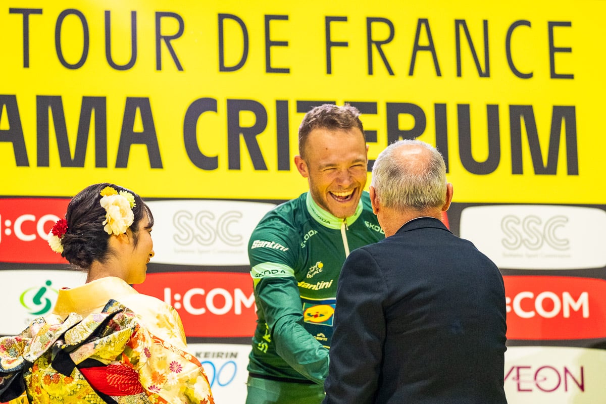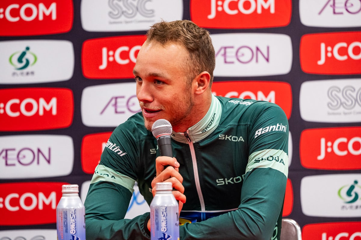 「レースと無関係な質問で恐縮なのですが…身長は何cmでしょうか? 196cmや193cmといったさまざまな情報が錯綜しているのですが…」と、筆者が質問したのは11月9日に行われたツール・ド・フランスさいたまクリテリウムのレース後記者会見。スプリントが届かずも2位に入り、緑色のマイヨヴェール(ポイント賞ジャージ)をまとったミランに聞いた。