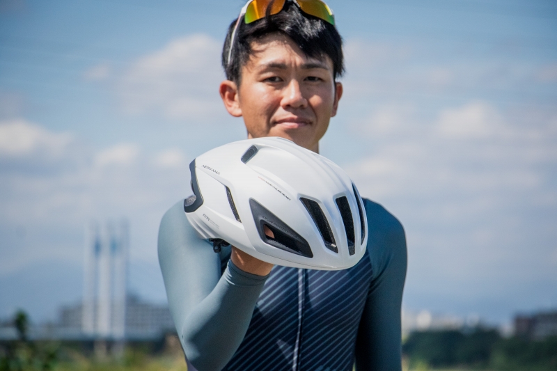 ケープラスの新作エアロヘルメット「AERVANA」のテストを担当するのはCW編集部員の高木。アジアンフィットのヘルメットが合う丸型頭の持ち主で、NOVAやALPHAといったケープラスの歴代モデルをテスト
