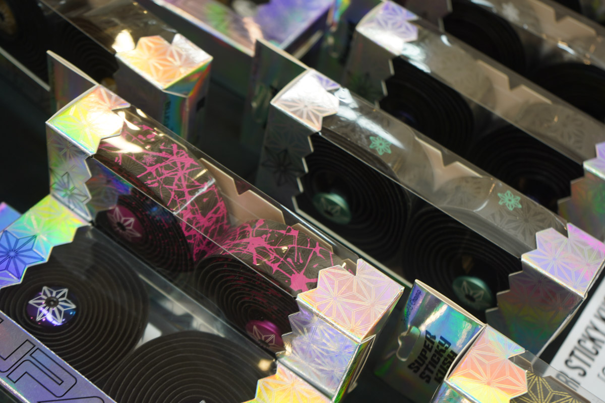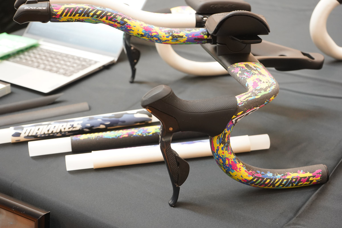今回の展示会ではレーブが展開するドロップハンドル用グリップ「マカレス」が注目の的だった。独自の素材を活かしたグリップ力と快適性が特徴だ。展示会では装着方法が気になる方も多かったようだ。またマカレスは自由にデザインできることも魅力とのことで、今後のオリジナル化の展開にも期待したい。