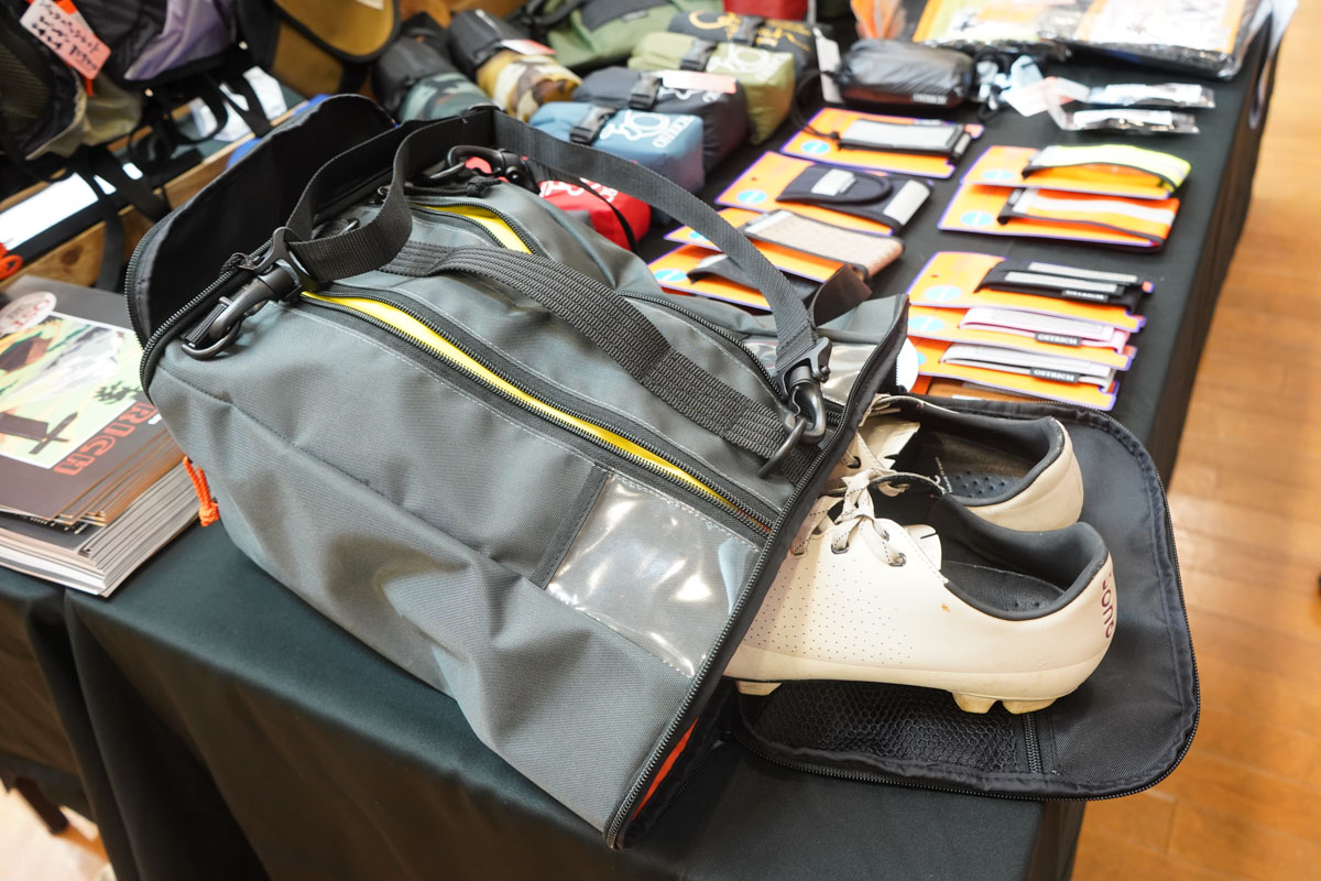 そして国内ブランドでは定番の存在として多くのサイクリストから愛されるのがオーストリッチだ。マチつきのOS-500をお披露目したばかりかと思えば、遠征にピッタリのボックス形状バッグの試作品を新たに用意。シューズやヘルメットを入れるのにちょうどよいため、製品化されれば注目してもらいたい存在だ。