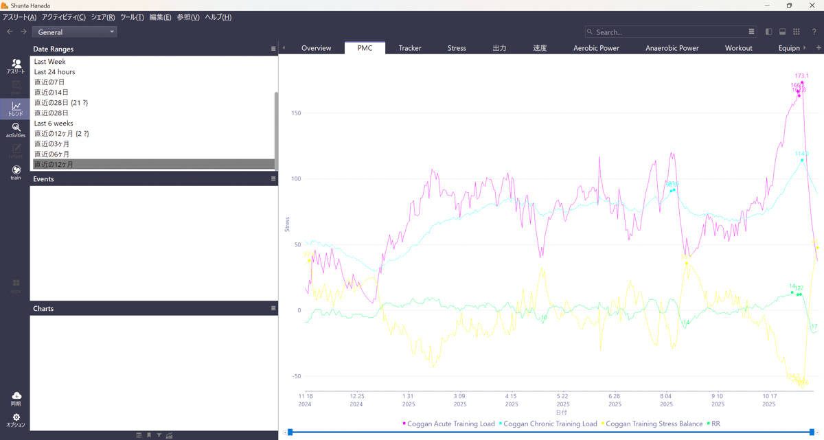 そうして積み上げたCTLは114。そう聞くと大したことはないようだが、Coggan Acute Training Loadの値は173.1まで急上昇しており、いかにおきなわに向けて追い込んだのかわかっていただけるかと思う。