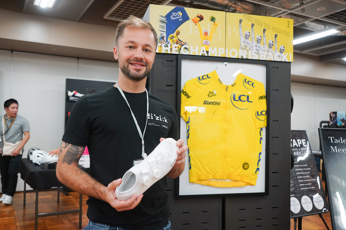 フィジークは本国から担当者が来日。シクロワイアードのインタビューや、カワシマサイクルサプライのスペシャルコンテンツに登場するニコラ・ポレッティ氏が、日本の展示会でショップスタッフらにラインアップを紹介していた。
