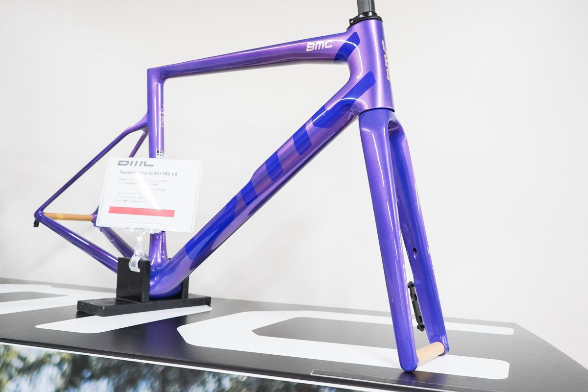 国内ではシマノULTEGRA DI2完成車と3種類のフレームセットで展開される。今回の展示会で目を引いたのはフレームセットのMetallic Blue Purpleだった。ベースカラーがベタ塗りの単色ではなく、パールカラーのように雰囲気のある色味とされており、高級感が際立っていたのが印象に残った。