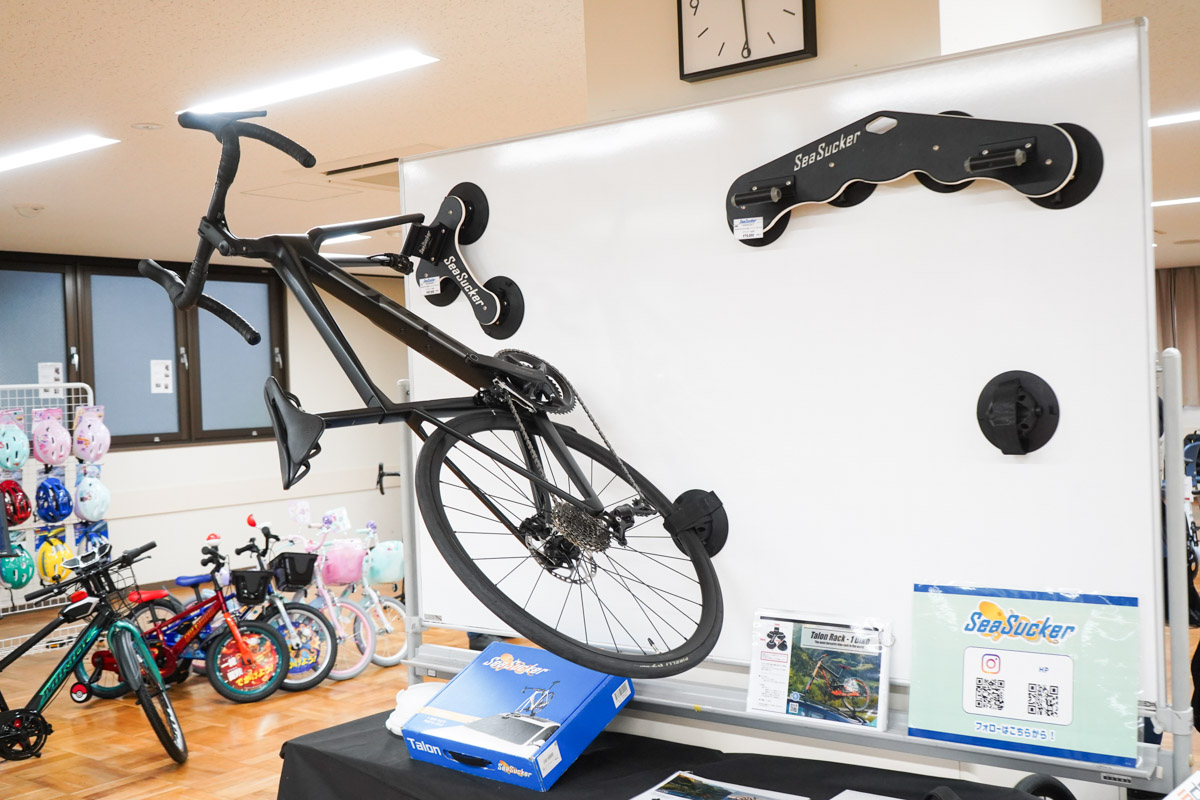 また今回シーサッカーの展示も注目の的だった。シーサッカーは吸盤を自動車のボディに吸着させるキャリアで、吸盤を真空状態にすることで固定力を高めることが特徴。その性能を示すようにホワイトボードにシーサッカーを装備、そこに自転車を乗せている展示で来場者の興味を引いた。