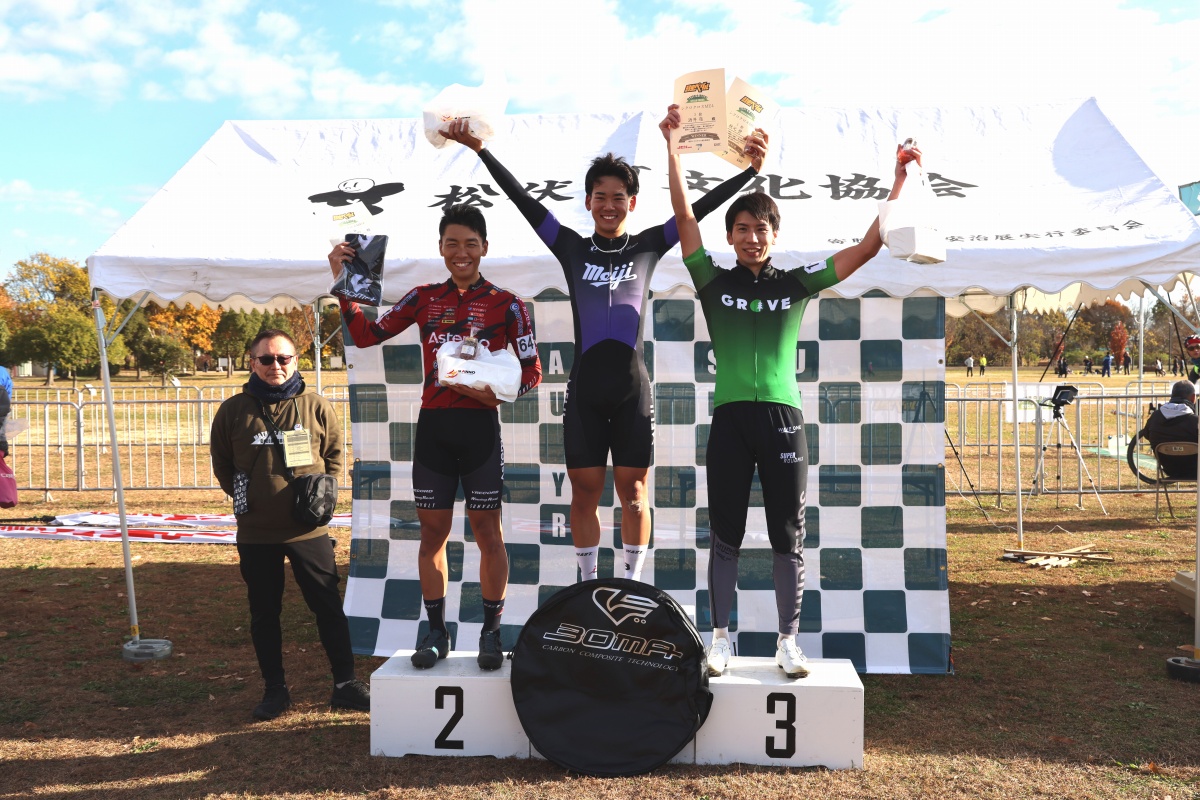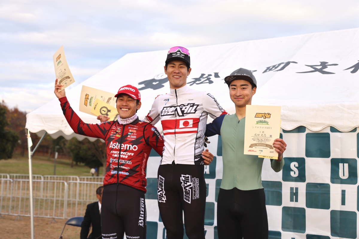 最後まで白い全日本チャンピオンジャージにふさわしい、力強い走りを披露した織田。先頭のままフィニッシュラインを通過し、地元の松伏シクロクロスで3連覇、そしてJCX4連勝を達成した。2位は35秒遅れで沢田、3位は42秒遅れで成田がフィニッシュラインを越え、表彰台に上がった。出走者73名中、完走者はわずか12名だった。