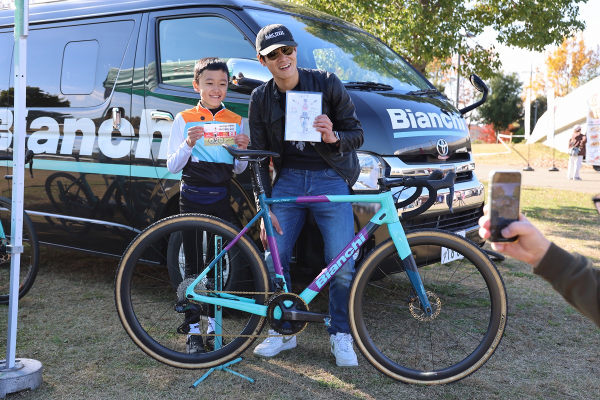 織田聖(弱虫ペダルサイクリングチーム)のイラストが描かれた色紙が若きファンからサプライズでプレゼントされた photo:Michinari TAKAGI