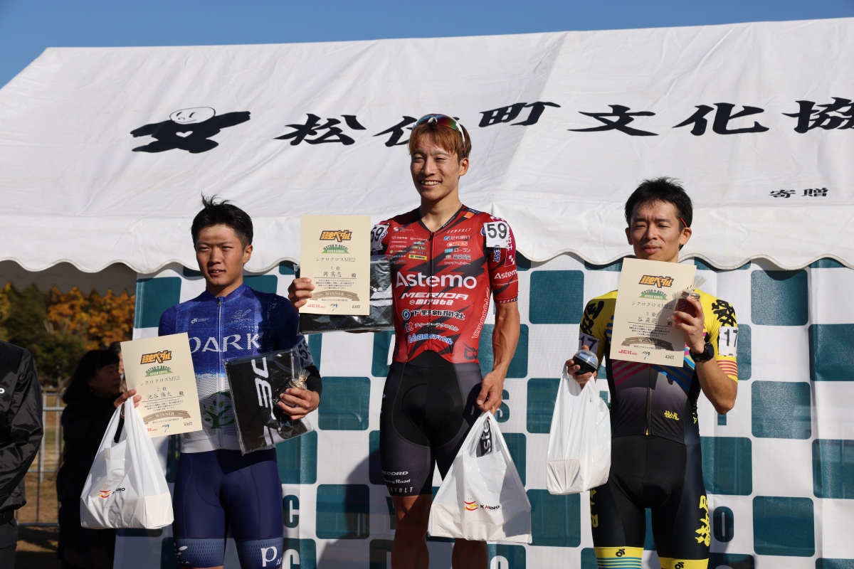 C2やC3、C4は全カテゴリー、JBCFの最高峰のJプロツアーを走る選手たちが全カテゴリーで勝利を挙げた。C2は岡篤志(Astemo宇都宮ブリッツェン)が最後尾スタートながら、先頭を独走し、圧勝した。なんと、ツール・ド・おきなわのチャンピオンレースで使用したウィニングバイクとなったメリダ SCULTURA TEAMにシクロクロスタイヤを履かせた仕様で参戦。さらに、フロント54-40Tのロードギア比を踏み切る豪脚を披露した。