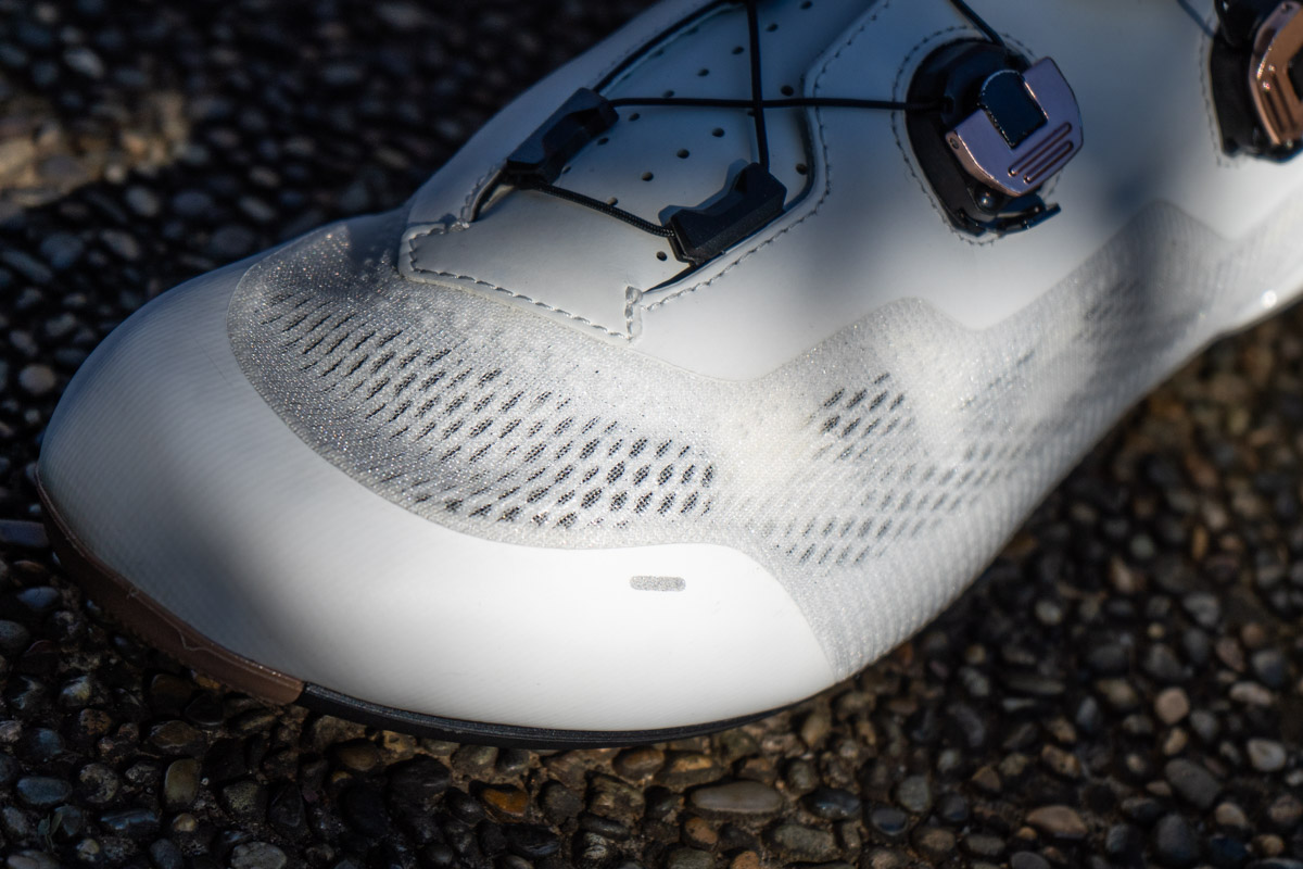 GENIUS X VAPOのオープンセルニットは非常に薄手に仕立てられており、優れた通気性は期待できそうだ。ニットは部位ごとに密度を変化させており、強度、耐久性、耐摩耗性を確保しながら、全体として軽量で通気性の高い構造を実現している。つま先部分などはTPU補強により必要な箇所での耐久性も確保されている。