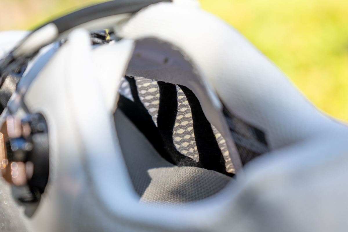 薄手アッパーを支えるために内側にFirmor Xというサポートパーツが配置されている。ソール側からダイヤルに向かってV字のサポートを配置することで足全体を包み込み、安定したフィットや、ハイパワーペダリング時のスタビリティを高めている。