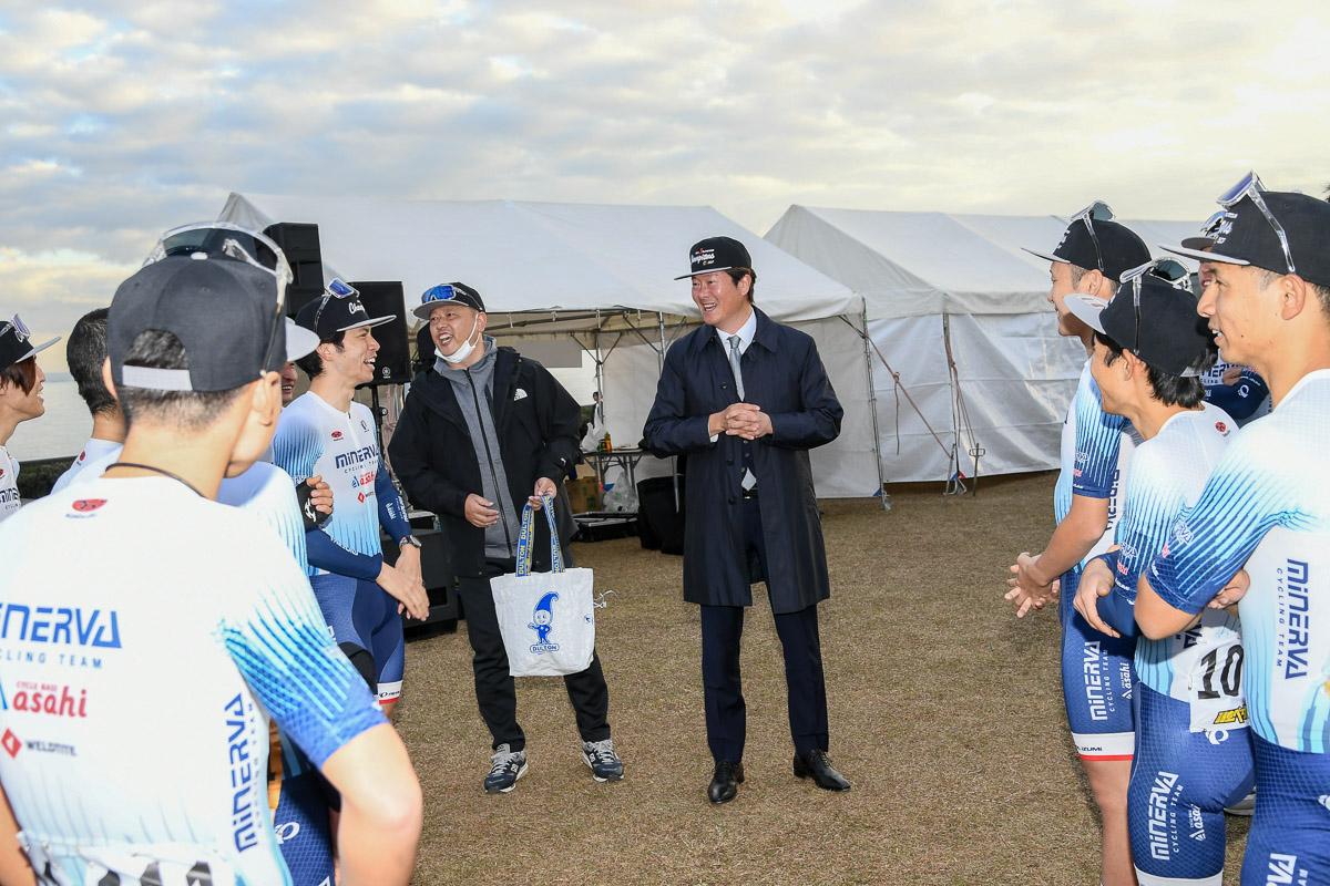 最終戦となった浦安クリテリウムには株式会社あさひの下田佳史代表取締役社長が駆けつけ、チーム3連覇をメンバーと共に祝った。