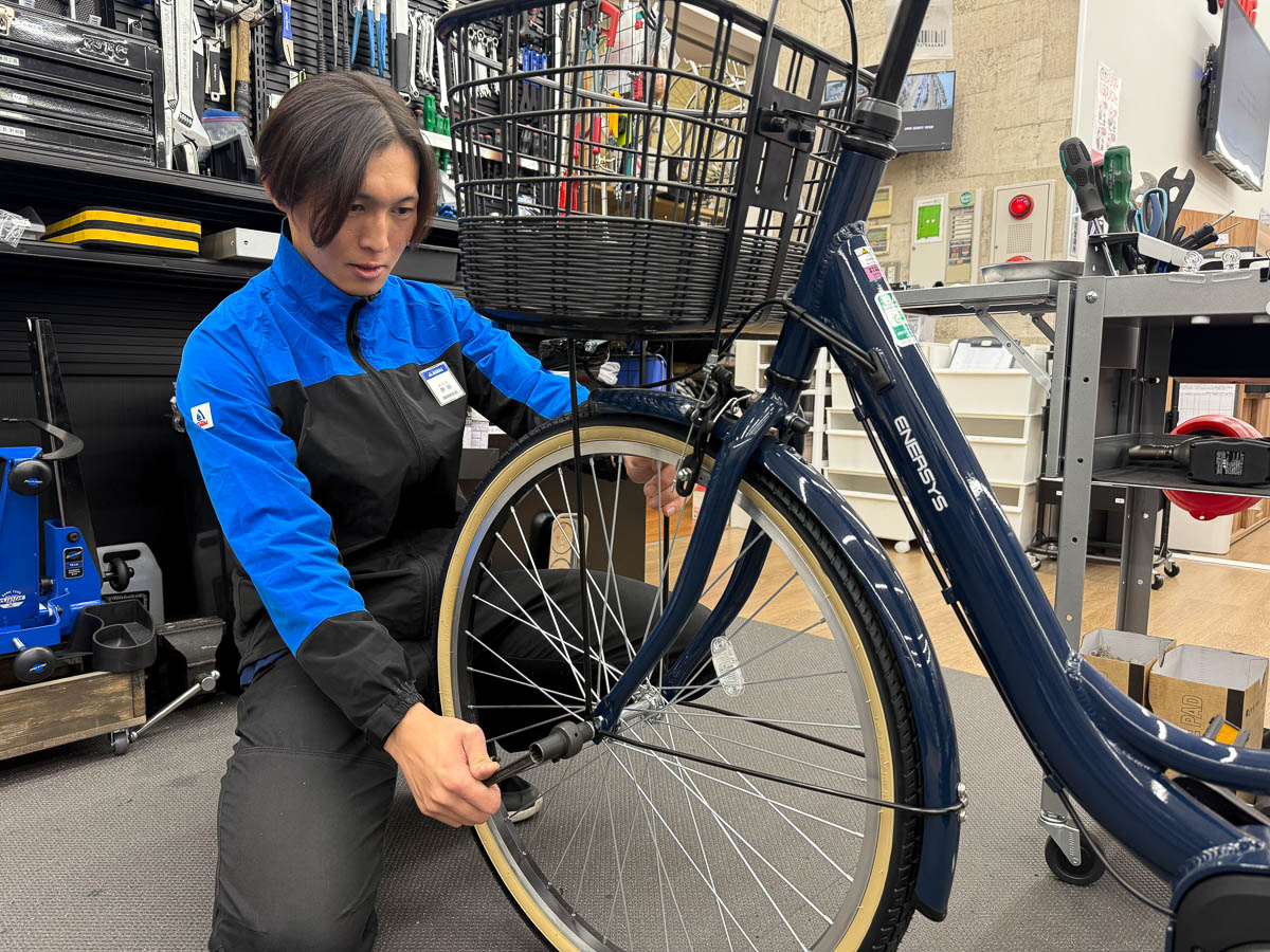 サイクルベースあさひの店舗で自転車を組む原田一輝 ©︎あさひ