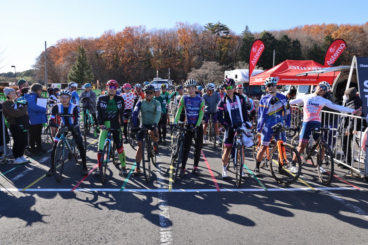 来週末に迫った全日本選手権の前哨戦ということもあり、男子エリートのスタートラインには全国から69名の選手たちが揃った。ロードで愛三工業レーシングへの加入が発表された全日本チャンピオン、織田聖(弱虫ペダルサイクリングチーム)と同じ先頭には、沢田時(Astemo宇都宮ブリッツェン)や副島達海(TRK Works)が並んだ。