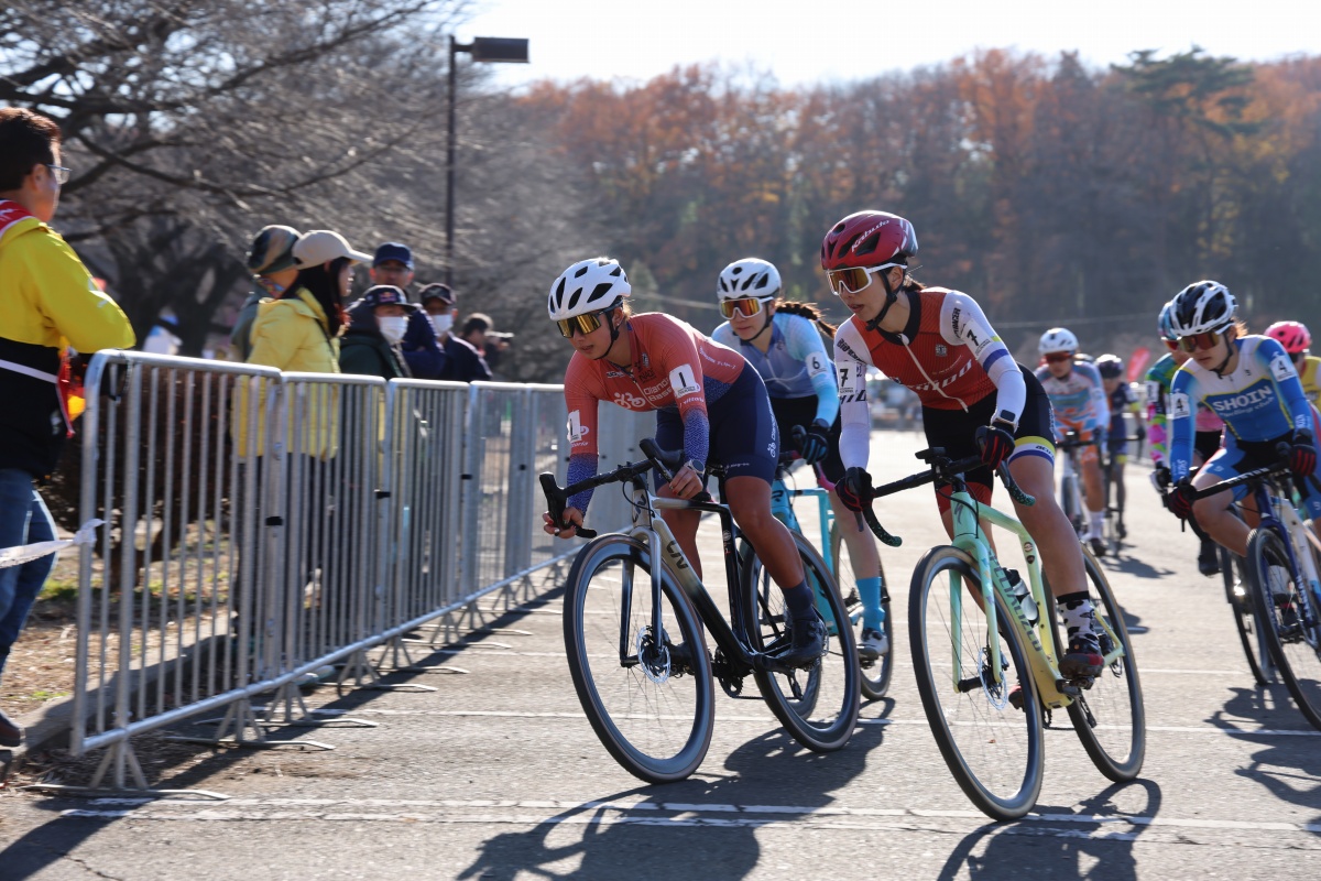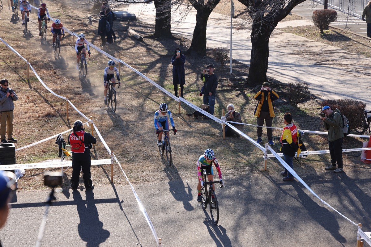 女子エリートのフロントローには、現日本チャンピオンの小林あか里(Liv Racing Japan)とJCXで4勝を挙げて好調な石田唯(TRKWorks)、前全日本チャンピオンの渡部春雅(OlandaBase)が並び、同時出走のジュニアカテゴリーの選手たちを含めた、19名がスタートの時を待った。