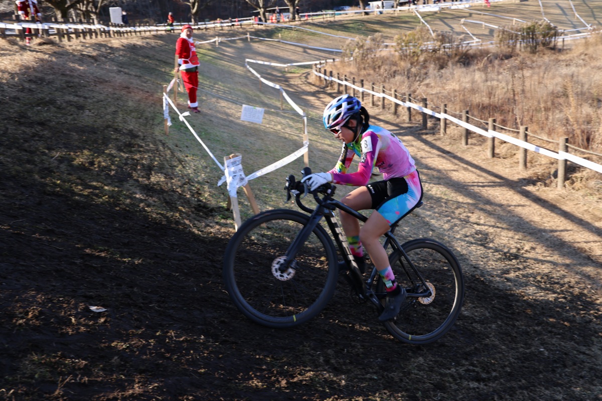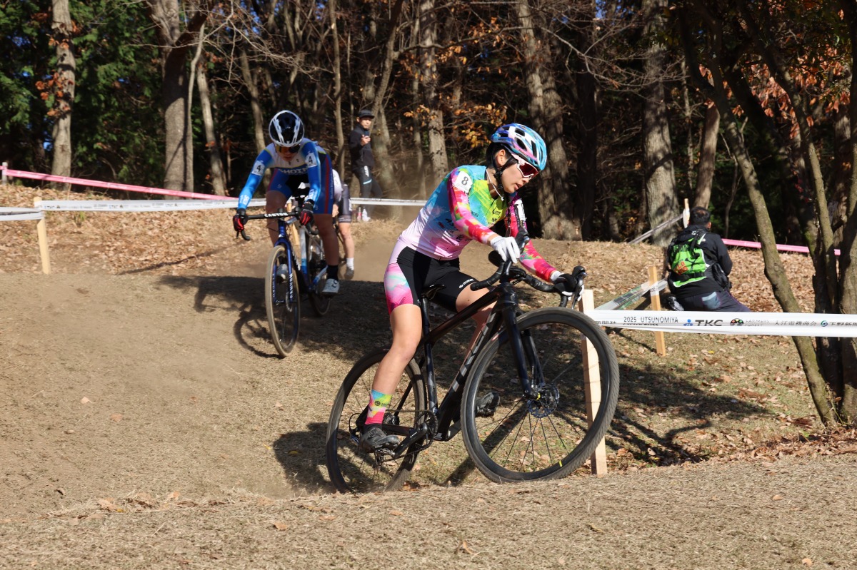 宇都宮シクロクロスの見どころである三段坂は、日吉を先頭に石川七海(八千代松陰高等学校)、石田、小林、竹村の順でクリアしていく。そしてマウンテンバイクコースでも使用されるテクニカルな森林区間を抜けて現れたのは、先頭パックを形成した日吉と石川。3番手の石田はキャンバーでスリップして落車し、先頭から遅れを取ってしまった。