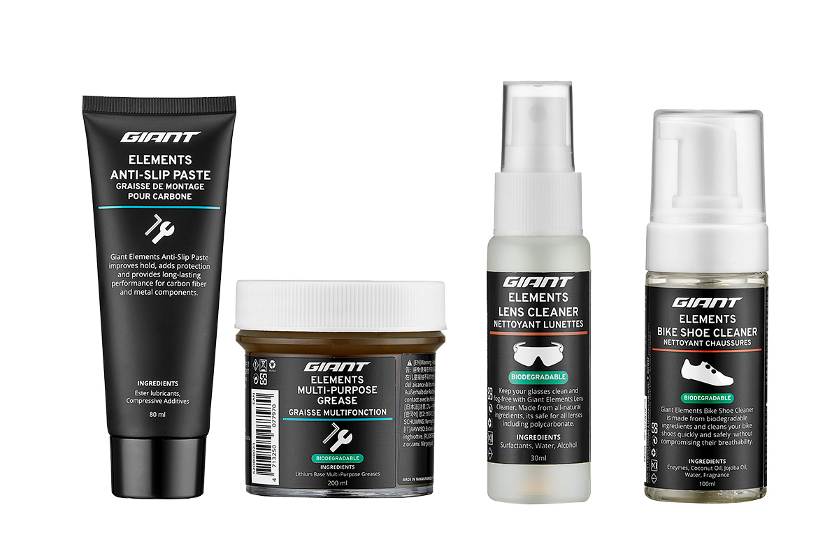 ジャイアント Elements Anti-slip Paste、Elements Multi-purpose Grease、Elements Bike Shoe Cleaner、Element Lens Cleaner (c)ジャイアント