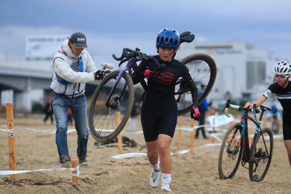 三上は言う。「風が強くて真っ直ぐ走ることも難しい状態でした。序盤は松村選手と競り合って、松村選手のほうが自分よりも速いパートが多くて難しかったんですが、ミスの無いよう集中して走り、中盤から独りになってからは自分でも気を抜かないように踏んでいきました。じつは少し前に体調を崩して復調したばかりでした。将来シクロクロスでは世界選手権で優勝したいんです」。