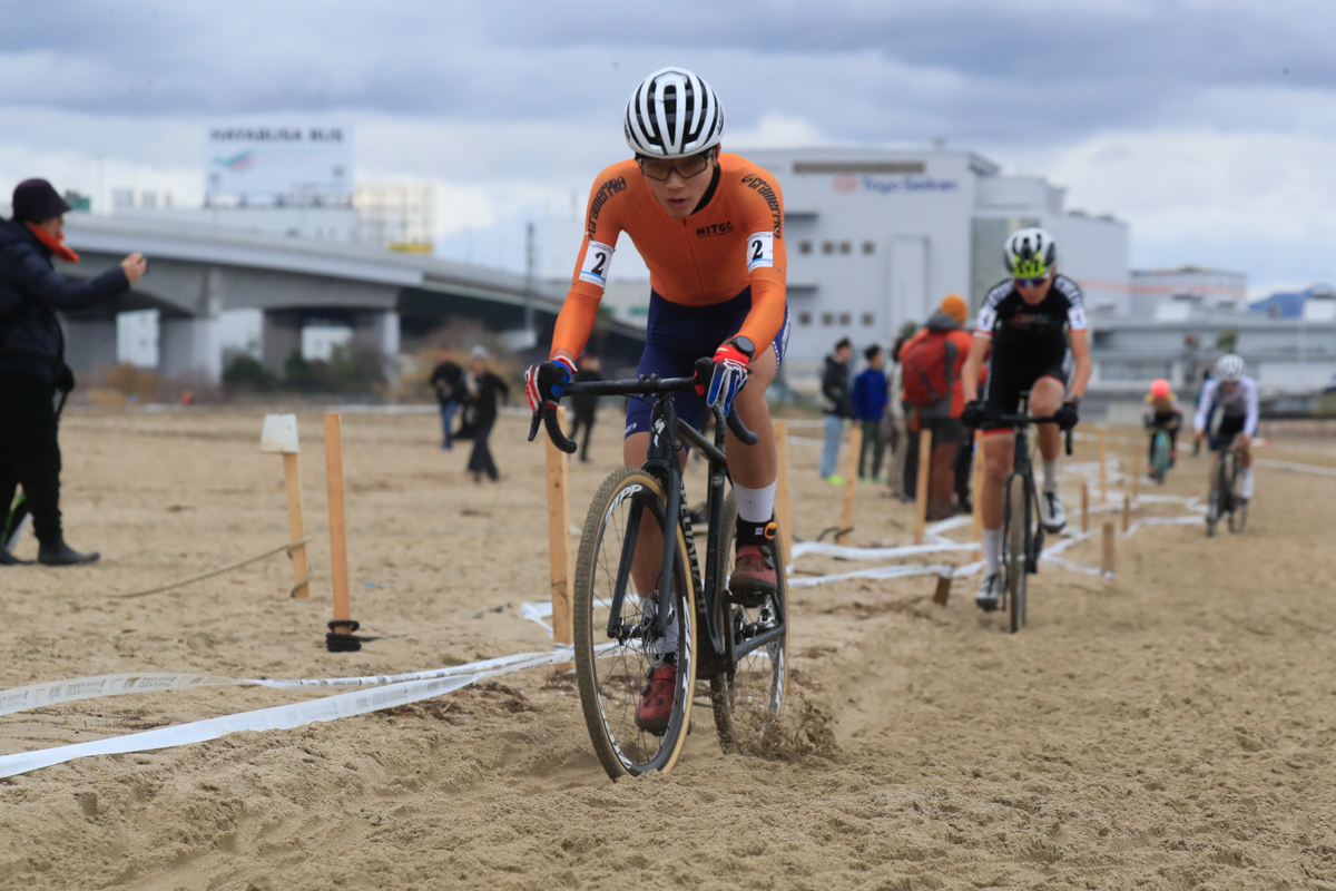 昨年はジュニアだったU23初年の野崎がサンドセクションで先行、柚木を引き離し始める。野崎は最初の浜際へのアプローチでスピードに乗ったまま轍にホイールを取られて杭に引っかかり転倒するも、柚木が追いつく前に再マウントして復帰すると、再び差を開きだす。