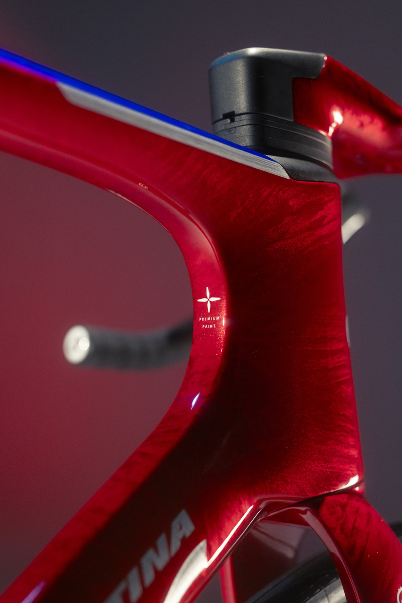 フレーム素材には東レのT800、T1100、M46JBを効果的に配置し、重量は従来型と同等の860g(Mサイズ)としながらもBB剛性は7.49%向上を果たしている。世界最高峰のプロ選手によるスプリントに応えるフレームを実現している。